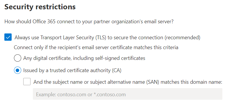 - Check to be sure that “Always use Transport Layer Security (TLS)” and “Issued by a trusted certificate authority (CA)” are selected. Click on Next.