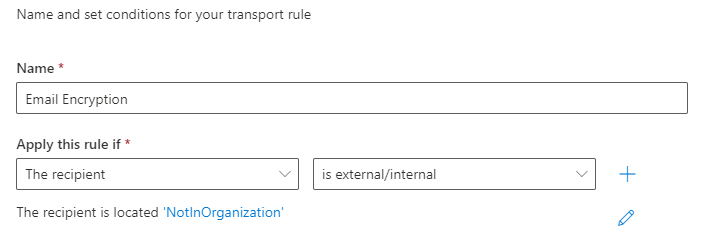 3. Type in a name for the rule you are creating, then click on the dropdown under “*Apply this rule if” and select "The recipient" next, select "is external/internal", then select "Outside the organization" and click the Save button.